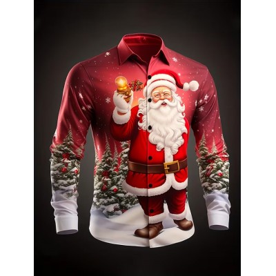 [Рождественская футболка с принтом Санты] Футболка с длинным рукавом с рождественским принтом Санты - 100% полиэстер, обычная посадка, обычный воротник, детали с пуговицами, 120 г/кв.м - идеально для Хэллоуина, Дня благодарения, новогодних праздников