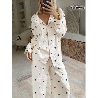 покрытие > Одежда и аксессуары > Женский комплект пижамы красного цвета с длинными рукавами и вишневым принтом - удобный дизайн с вишнями, застежка спереди на пуговицах, воротник-жабо, комфорт круглый год, повседневный стиль, идеально для дома