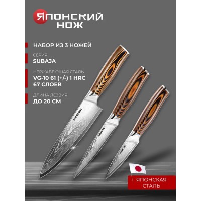 Набор кухонных ножей из дамасской стали, Seburo SUBAJA Damascus, Поварская тройка - профессиональные японские ножи