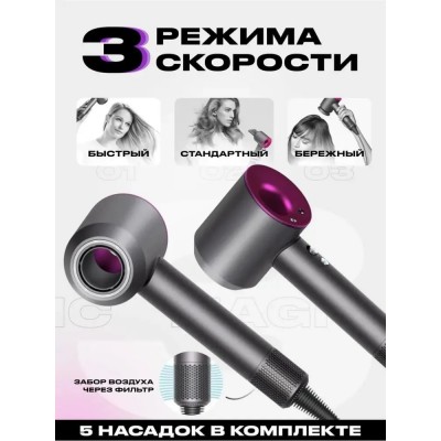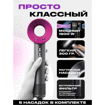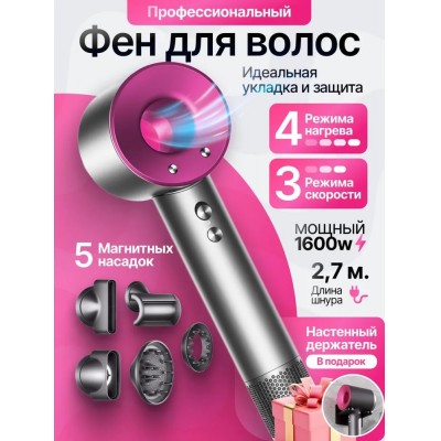 покрытие > бытовая техника > Фен для волос профессиональный, с 5-ю магнитными насадками и ионизацией, 1600Вт, розовый